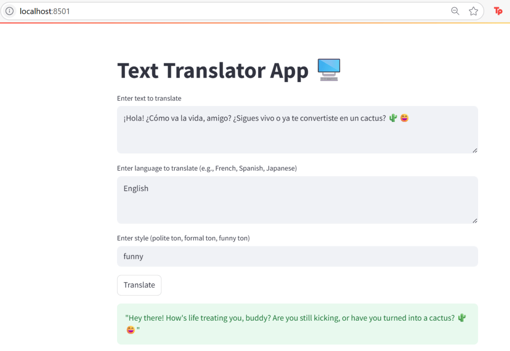 st.text_area/st.text_input: Streamlit elements to collect user input.translator_chain.run(...): Sends the prompt to the model and returns the result.